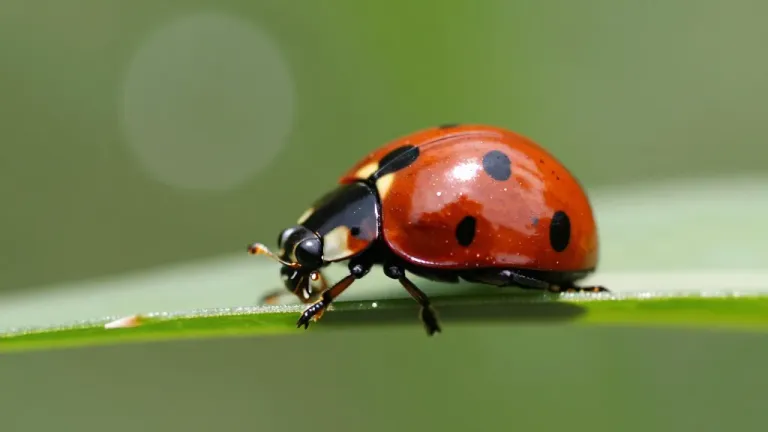 A glossy ladybug rests on a dew-covered grass blade, its vibrant red shell contrasting with the soft, diffused morning light. The shallow depth of field blurs the background, emphasizing the ladybug and dew beads, creating a serene, natural setting.
