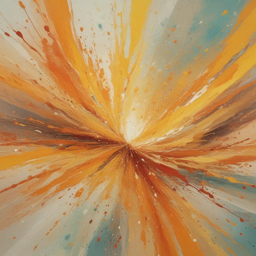A vibrant burst of orange and yellow paint splatters radiates outward from a central point, creating a warm glow. The blurred background emphasizes the dynamic movement and texture of the paint splatters.