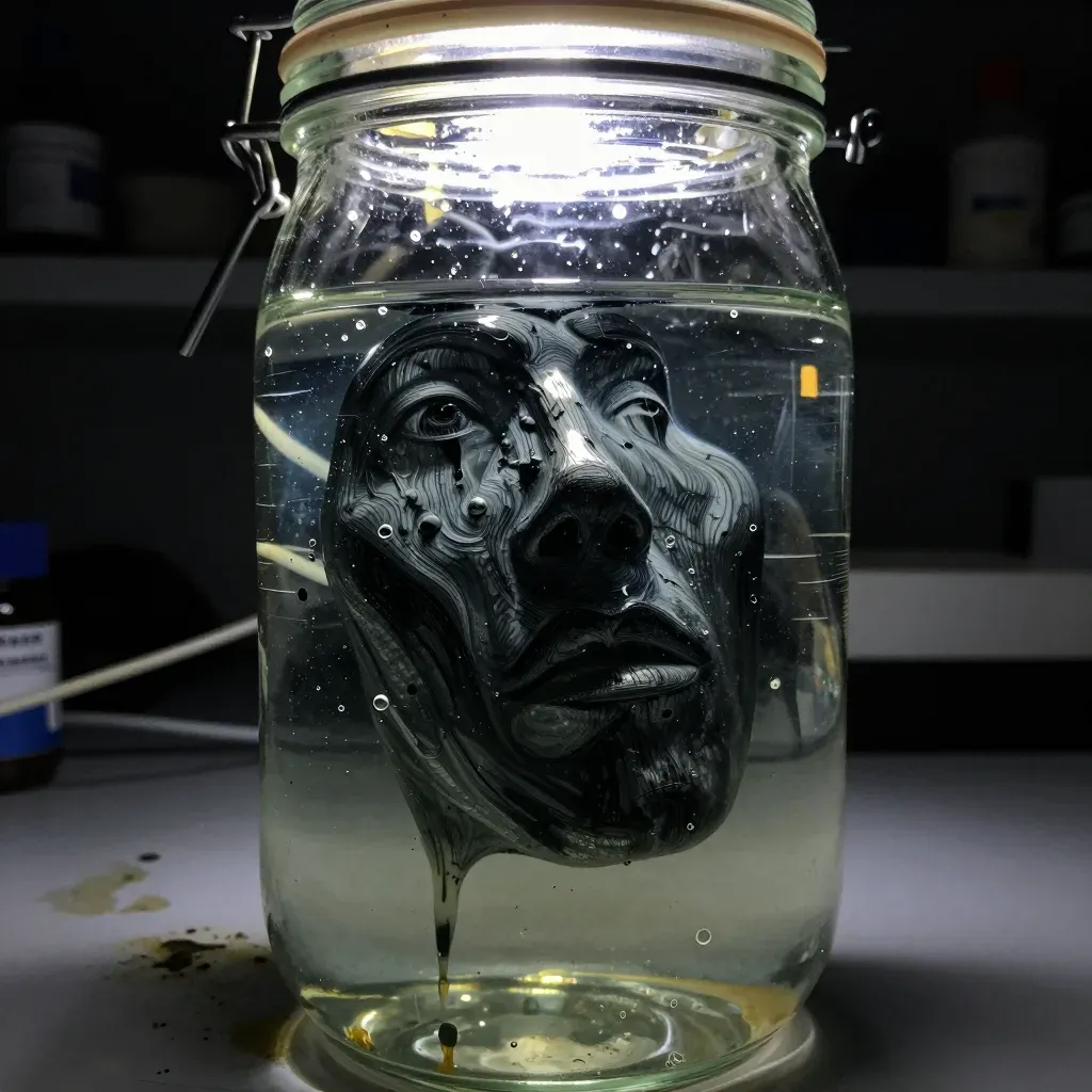 A dark, glossy substance resembling a human face is preserved in a glass jar, illuminated by soft overhead light that highlights the texture and reflections on the liquid and jar surface. The blurred laboratory background provides context without distracting from the specimen.