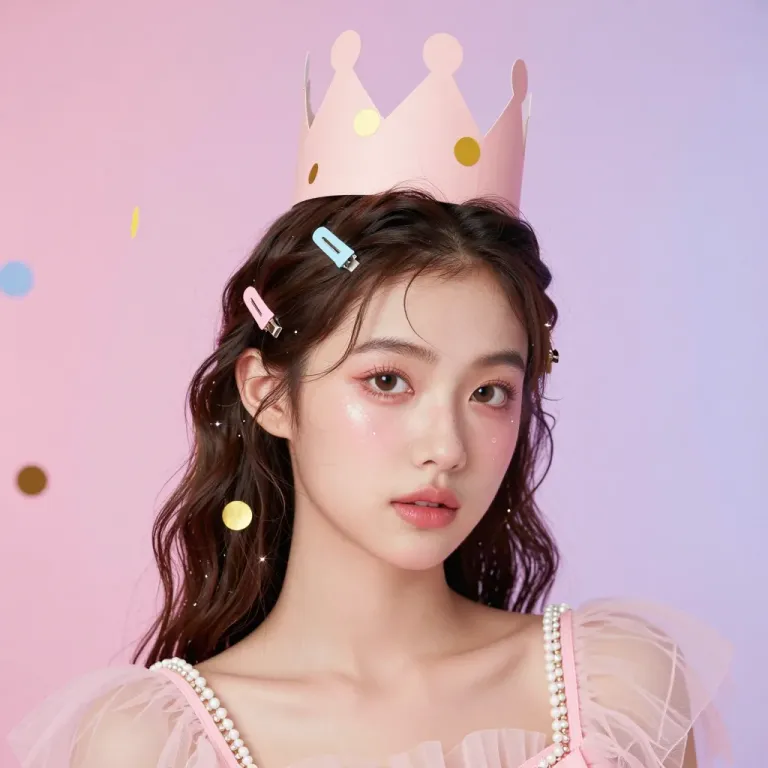 A young woman adorned with a pink paper crown and a delicate pearl-adorned tulle dress, bathed in soft, diffused light that highlights her glossy hair and the texture of her dress, set against a blurred pink backdrop with golden confetti, creating a dreamy and celebratory setting.
