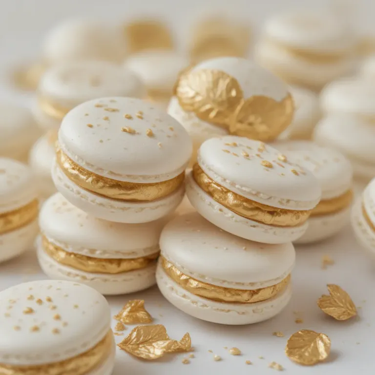Stacked white macarons with edible gold leaf, softly lit from above, highlighting the delicate texture and elegant design. The shallow depth of field and clean white background emphasize the macarons' luxurious appearance.