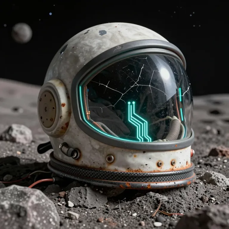 A cracked astronaut helmet with neon blue circuit lines glows against the muted lunar landscape, highlighting its worn, gritty texture. The composition emphasizes the helmet's intricate details and the stark contrast between the cold glow and the rugged lunar terrain.