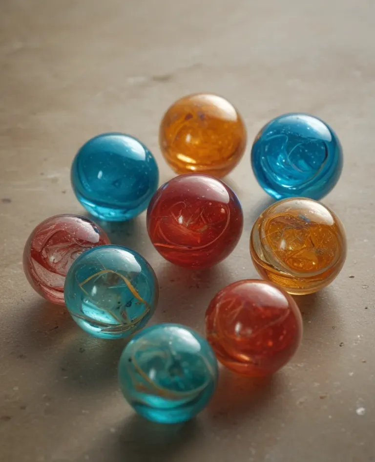 A loose cluster of glossy marbles in various colors, including blue, red, amber, and orange, arranged on a smooth, light gray concrete surface. The soft, diffused light highlights the reflective surfaces and creates a subtle depth of field, slightly blurring the background.