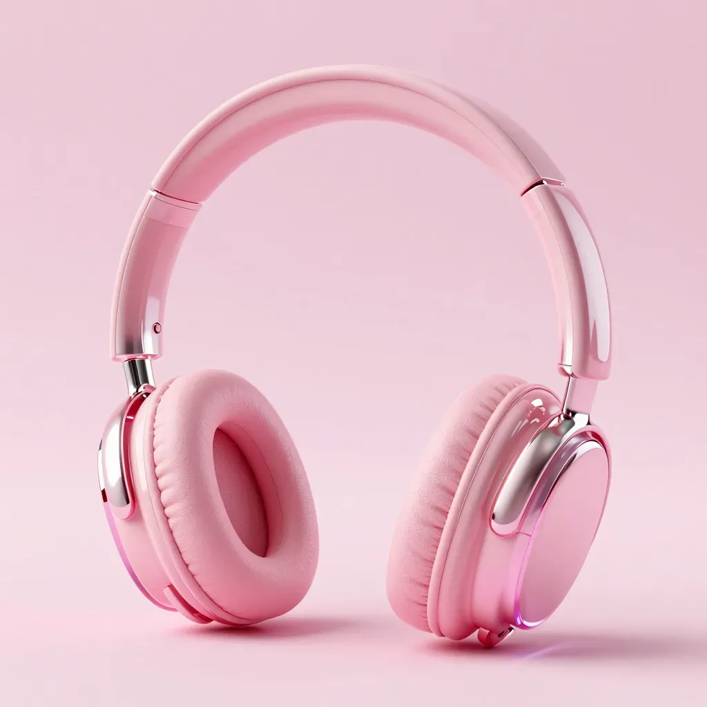 A pair of light pink over-ear headphones with glossy metallic accents, softly illuminated by diffused light, creating a subtle glow. The composition is centered with a slight tilt to the right, emphasizing the headphones against a blurred pastel pink gradient background.