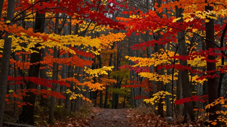 A dirt path lined with vibrant red and yellow autumn leaves leads through a dense forest, creating a warm, inviting glow. The soft, diffused light filtering through the trees enhances the rich colors and depth of the scene, inviting exploration.