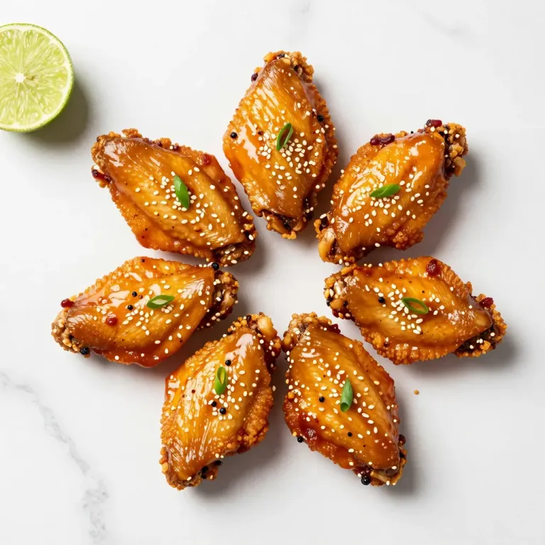 Six glazed chicken wings with crispy skin and sesame seeds are arranged in a radial star pattern alongside a lime wedge, showcasing a glossy, sticky glaze and vibrant green herb flecks. Soft overhead lighting creates subtle highlights on the glaze and seeds, while the clean white marble background with faint veining provides ample copy space and a minimalist aesthetic.