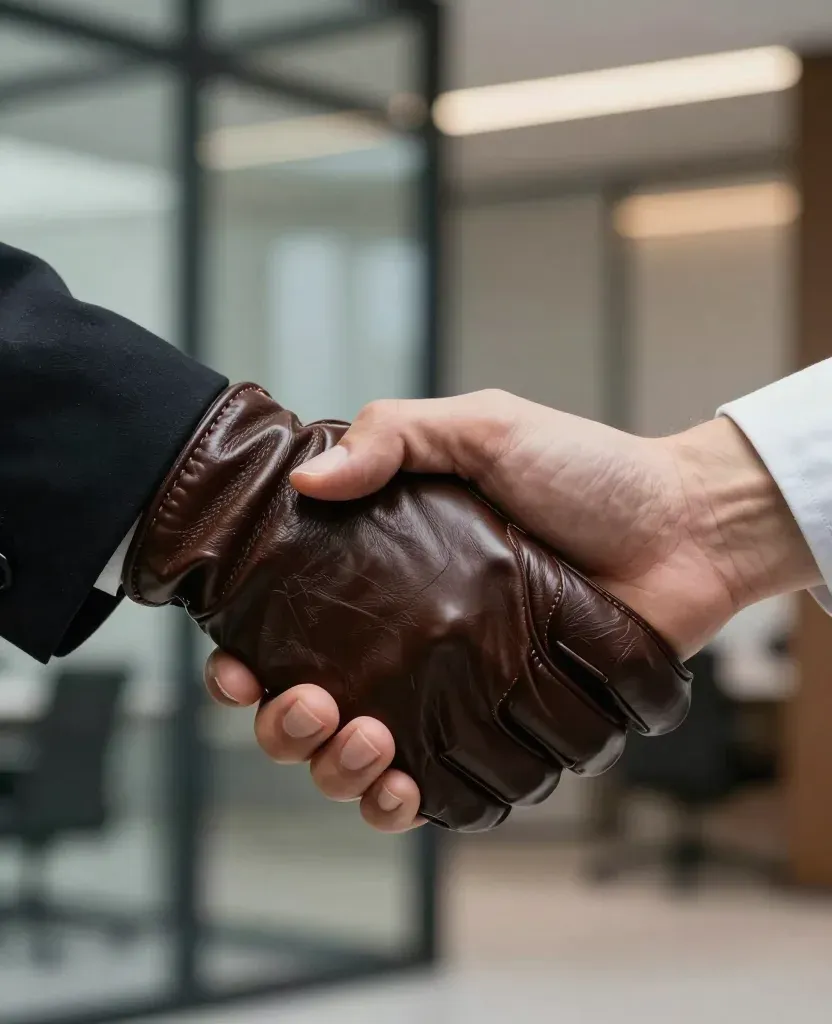 A close-up of a hand in a brown leather glove shaking hands with a bare hand, set against a softly lit, blurred office background. The warm, diffused light highlights the textures of the glove and bare hand, creating a professional and polished atmosphere.