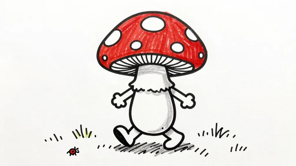 A large red mushroom with white spots and a small flower on its stem stands in a soft, dappled light forest setting. The gentle lighting and blurred background create a magical, serene atmosphere, ideal for nature and fantasy-themed designs.