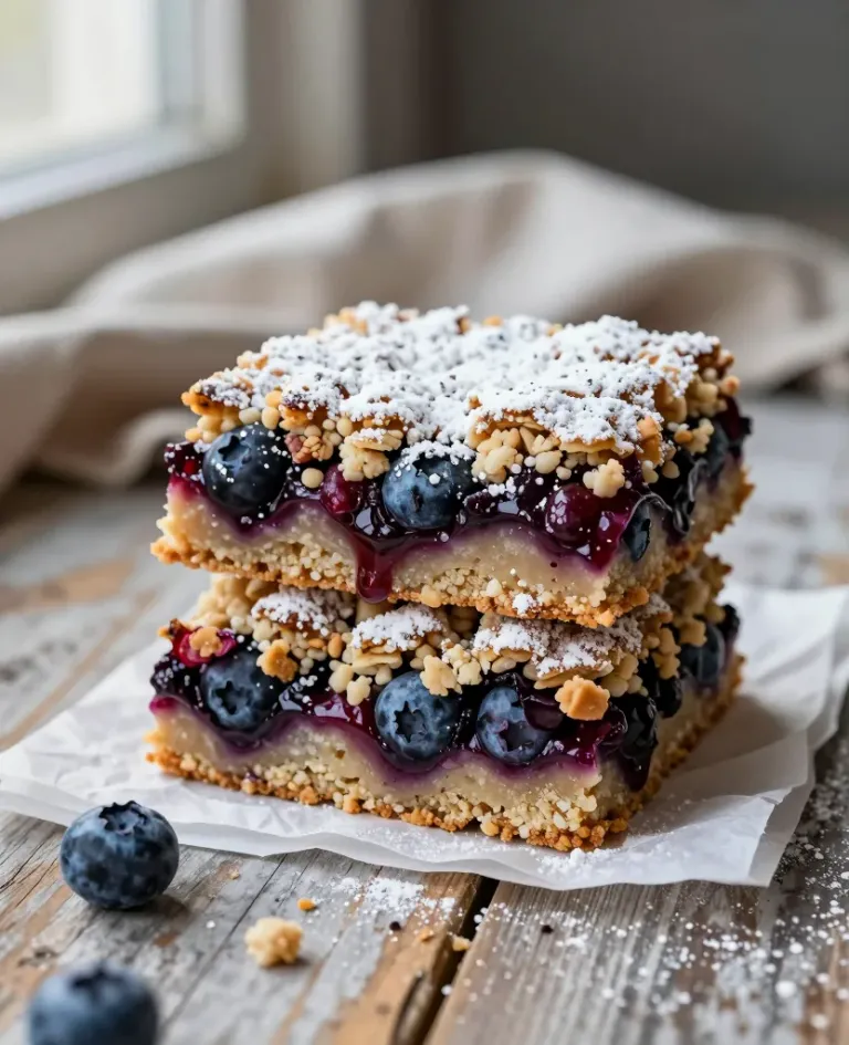A close-up of golden-brown blueberry crumble bars stacked in a pyramid, dusted with fine powdered sugar, with glossy blueberries and a crumbly crust, bathed in soft, diffused light that creates a warm and inviting glow. The shallow depth of field and natural light from a window emphasize the texture and color of the dessert, making it perfect for culinary and food photography.