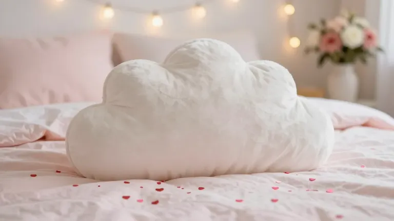 A velvety cloud pillow rests on soft pink linens, scattered with red heart confetti, creating a romantic and cozy atmosphere. The warm, ambient lighting highlights the pillow's contours and the delicate textures of the linens and flowers in the background.