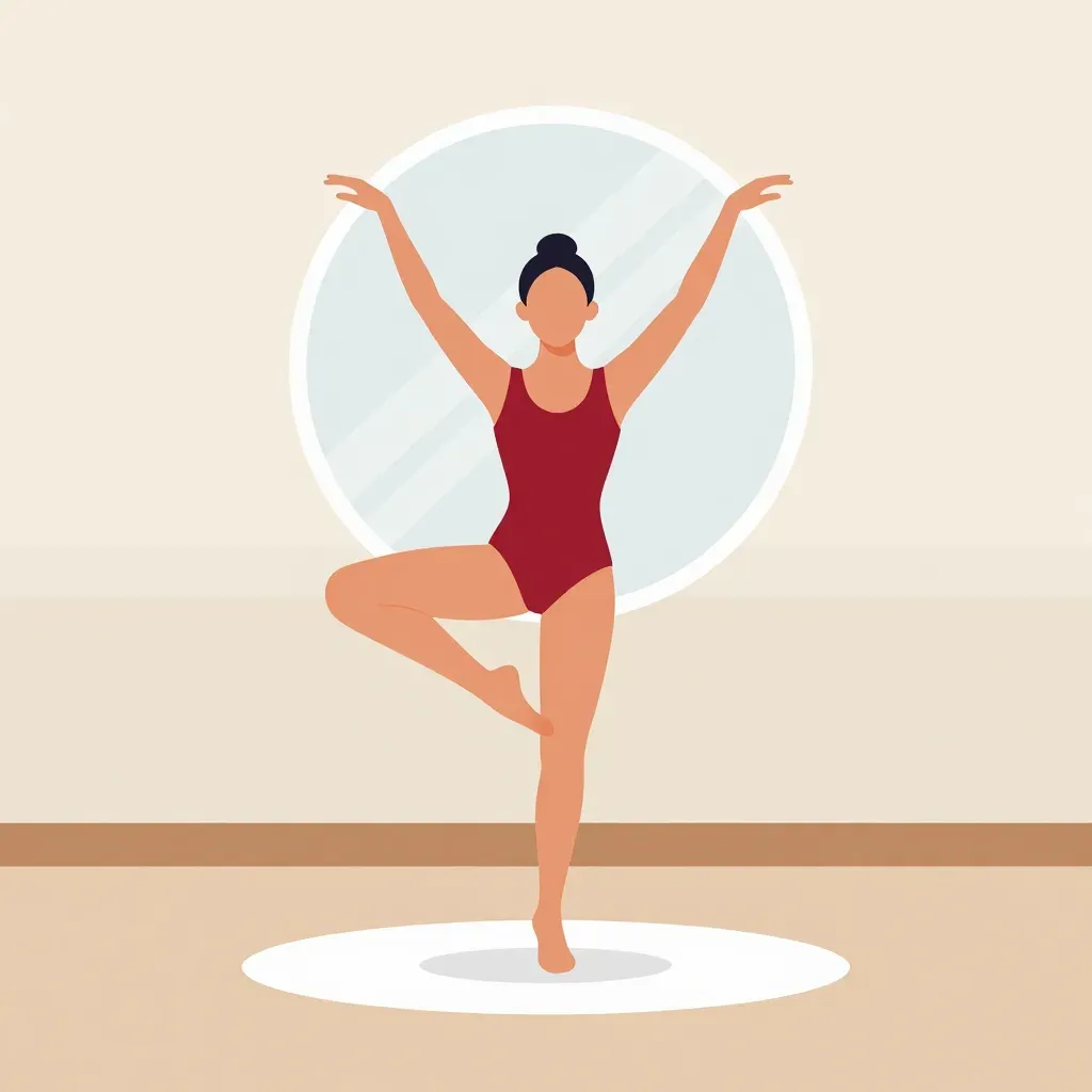 A female ballet dancer performs an arabesque en pointe, wearing a burgundy leotard with hair in a bun, her lifted leg bent behind her and arms gracefully extended. The soft, even front lighting highlights her form against a minimalist studio backdrop with a circular mirror and neutral tones, providing clean composition and ample negative space.