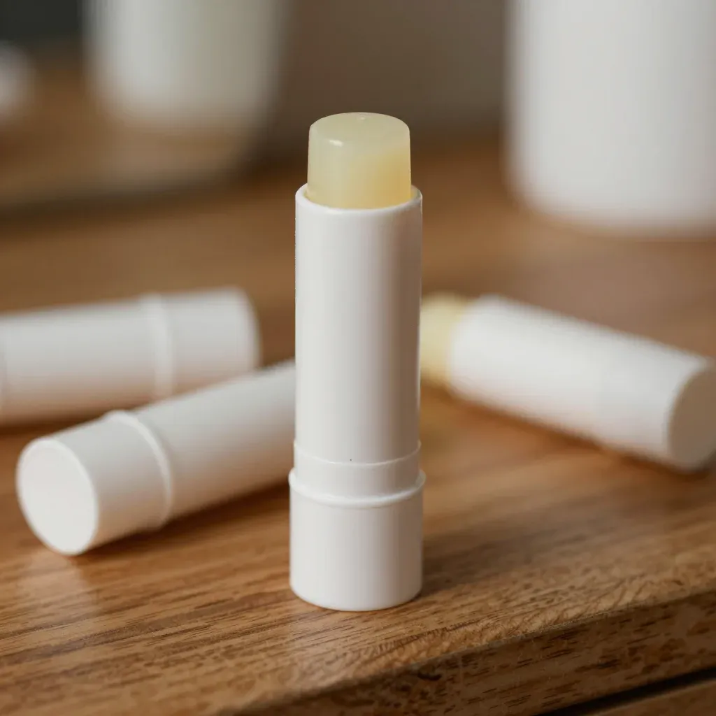 Close-up of creamy lip balm tubes with matte white caps, softly lit from above, creating gentle shadows and highlights on a warm brown wooden surface. Shallow depth of field focuses on the tubes, suggesting a natural, indoor setting.