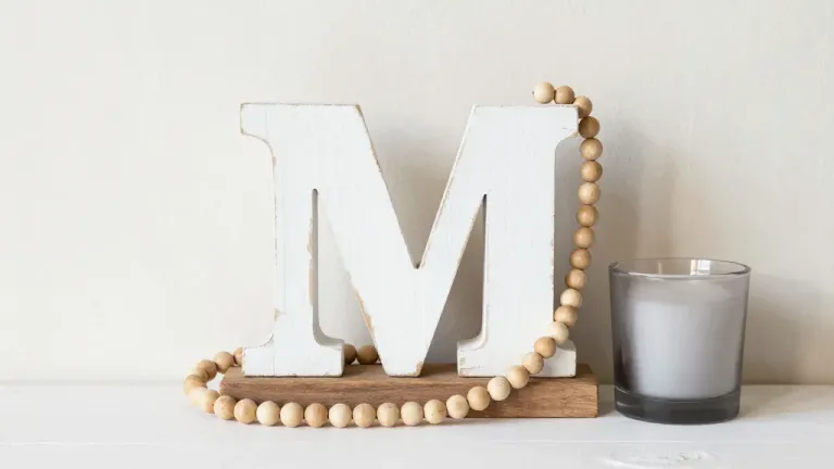 A rustic letter block, beads, and small white candles are arranged in a balanced, centered composition against a plain white wall. Soft, diffused lighting highlights the textures and creates gentle shadows, emphasizing the natural wood tones and smooth beads.