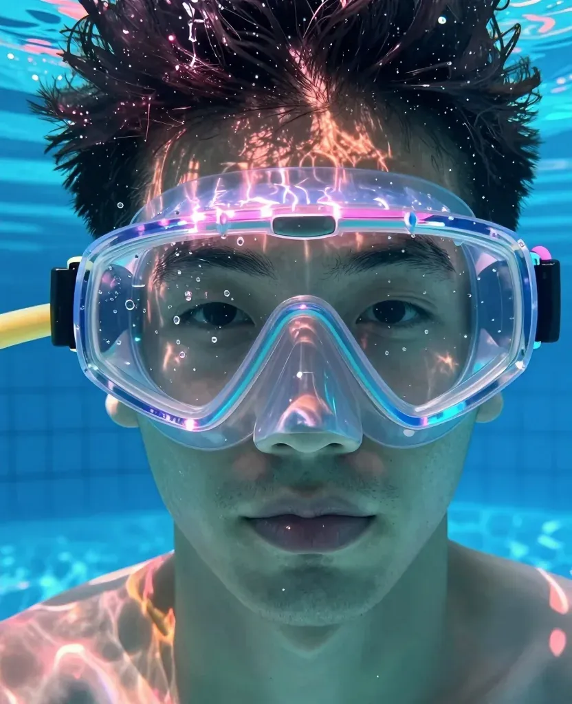 A diver's face, wearing glossy goggles, is captured in a close-up shot with soft, diffused underwater lighting, highlighting the blue and pinkish reflections in the clear water. The shallow depth of field keeps the focus on the diver's face while the slightly blurred background of the pool water and grid pattern adds depth and context.