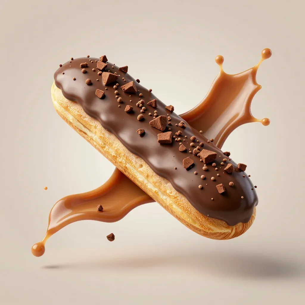 A golden, flaky eclair is coated in glossy chocolate glaze and topped with crunchy chocolate shavings, with a thick, luscious caramel sauce cascading down. The warm, directional lighting highlights the glossy textures and creates a sense of depth and dimension, while the neutral, blurred beige background keeps the focus on the eclair.