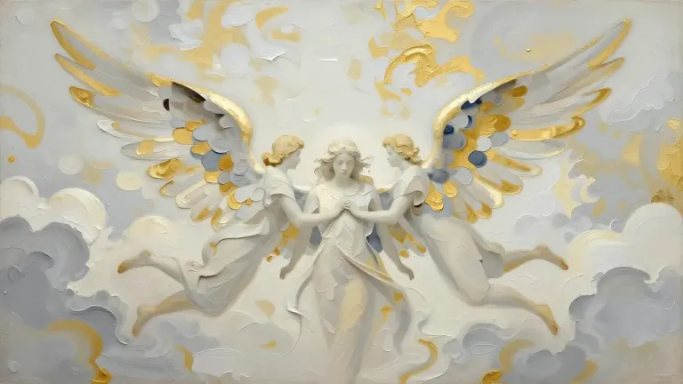 Three ethereal angelic figures with large, golden-winged wings are centered in a dreamy, cloud-filled sky, illuminated by soft, diffused light. The composition is balanced and symmetrical, with a three-dimensional effect created by the impasto technique.