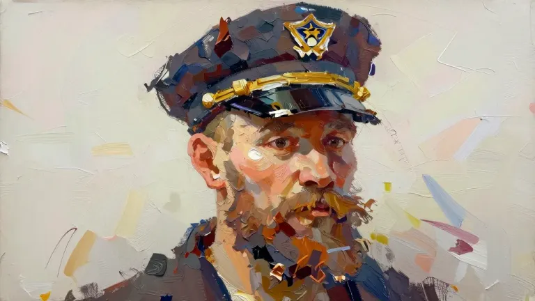 A weathered harbor captain in a textured, layered uniform stands against a softly lit, diffused background, emphasizing the subject's rugged features and maritime setting. The composition focuses on the captain's face and upper body, with a slight tilt to the left, creating a sense of depth and character.