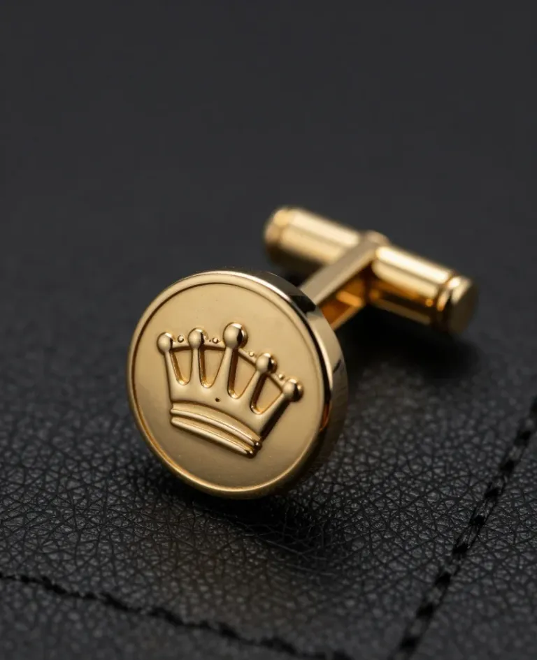 A close-up of a gold cufflink with an embossed crown design, set against a dark, textured leather background. Soft, diffused lighting highlights the cufflink's details and reflective surface, creating a luxurious and elegant atmosphere.