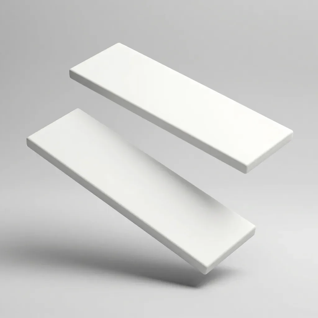 Two glossy ceramic tiles float diagonally against a minimalist gray background, illuminated by soft diffused light that casts gentle shadows, creating a balanced and symmetrical composition.