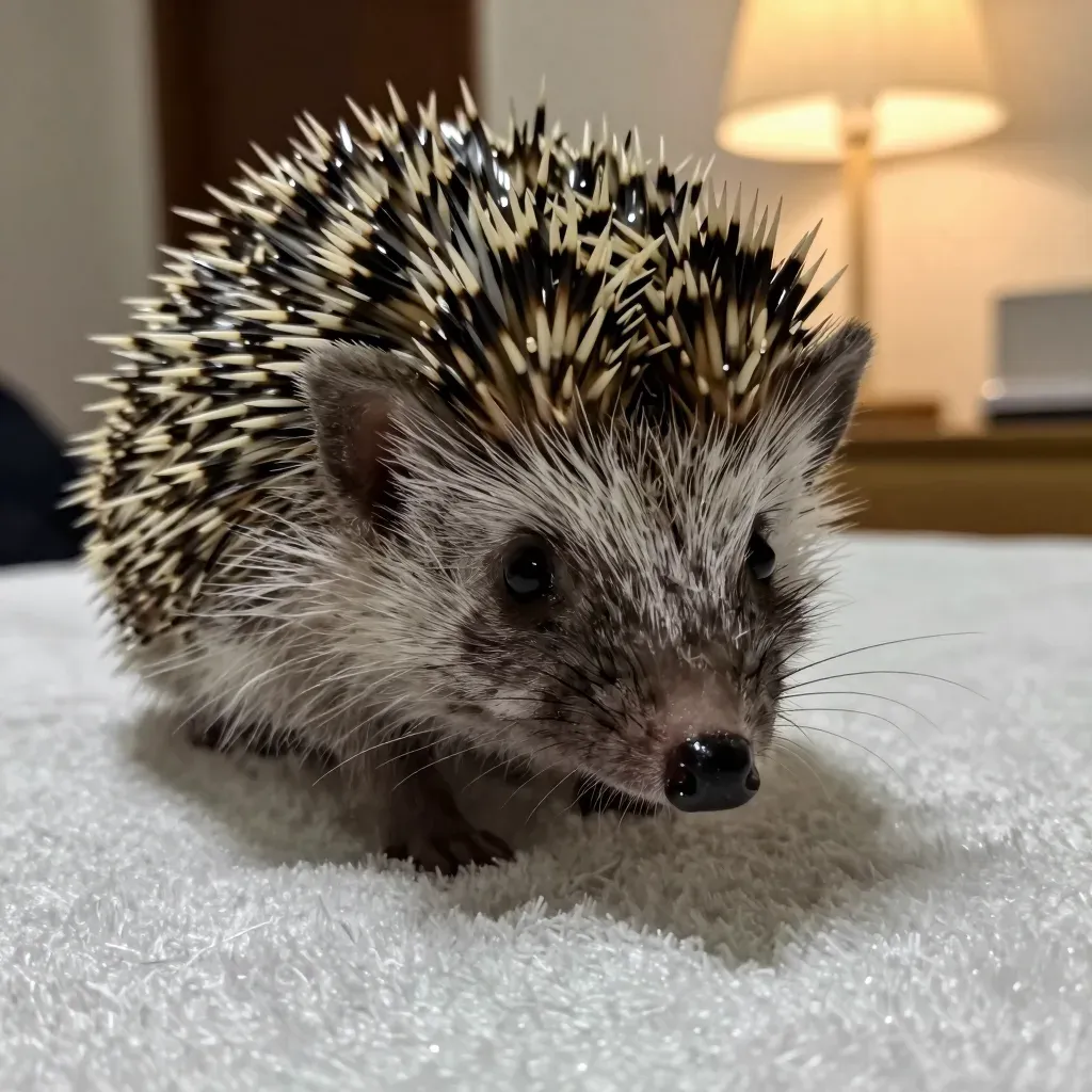 A hedgehog curls into a ball, showcasing its glossy quills against a soft, fluffy white towel. Warm ambient light highlights the hedgehog's features, creating a serene and intimate portrait with a shallow depth of field.
