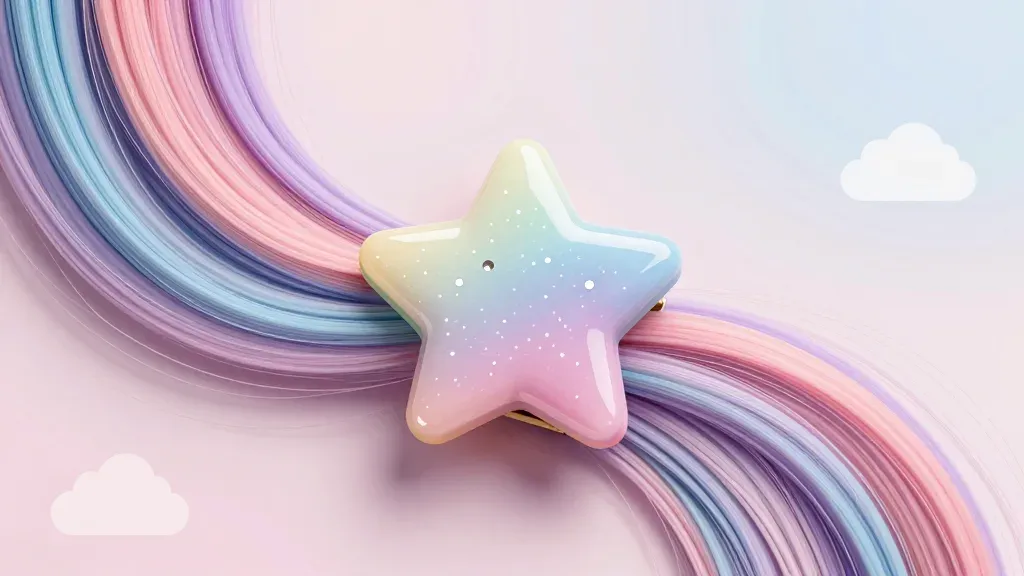 A glossy, star-shaped hair clip with pastel hues and white speckles gleams against a soft, diffused light and a blurred background of pastel swirls and white clouds, creating a dreamy, shallow depth of field.