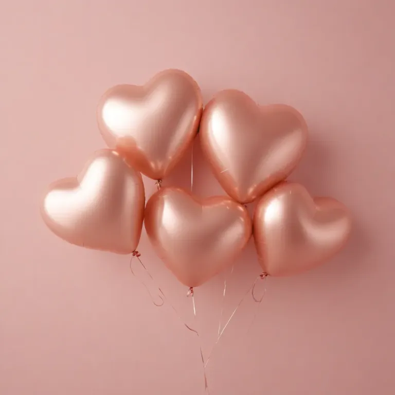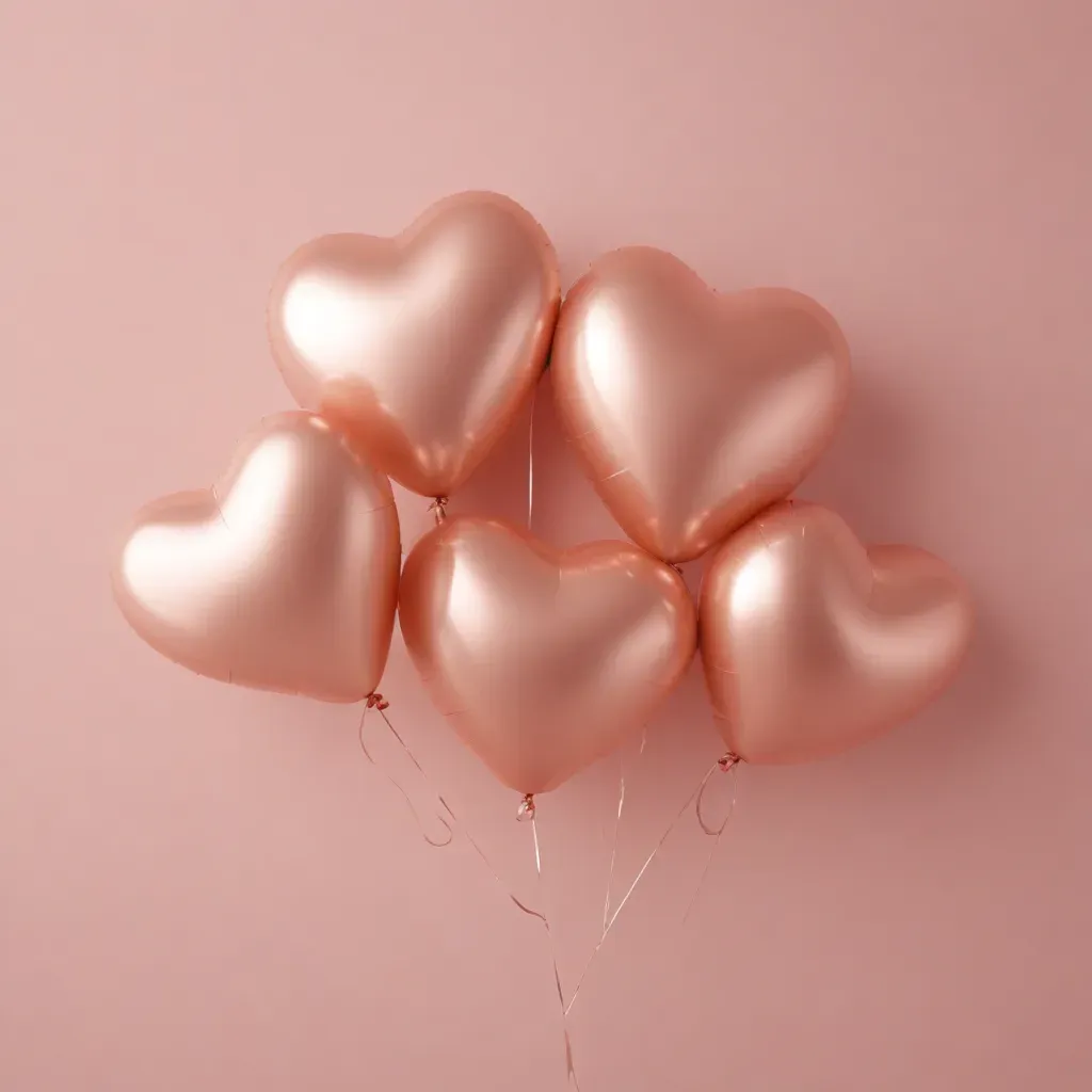 Six rose-gold heart-shaped balloons gleam under soft, diffused light, creating highlights and reflections. The solid pink background, blurred and out of focus, emphasizes the balloons and provides a clean, elegant backdrop.