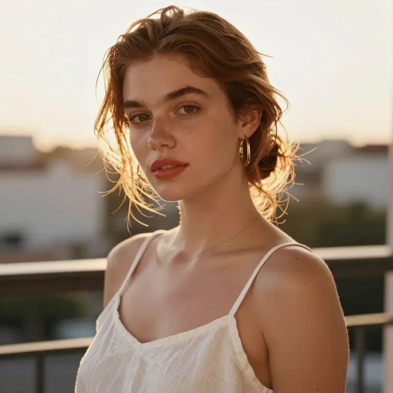 A woman with tousled hair and a white dress stands on a balcony, bathed in soft golden light. The shallow depth of field and warm tones create a serene and intimate portrait.