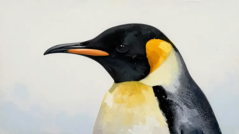 A close-up of a penguin's head and upper body, showcasing glossy feathers and a vibrant orange beak. The diffused, soft lighting highlights the texture and color, creating a clean and unobtrusive backdrop.