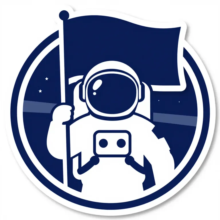 A white-suited astronaut stands centered in a circular emblem, holding a navy blue flag aloft against a minimalist space backdrop with scattered stars and horizontal banding. Diffuse front lighting creates soft highlights on the helmet and suit, while the clean, symmetrical composition and cut-out edges suggest high utility for digital badges or stickers.