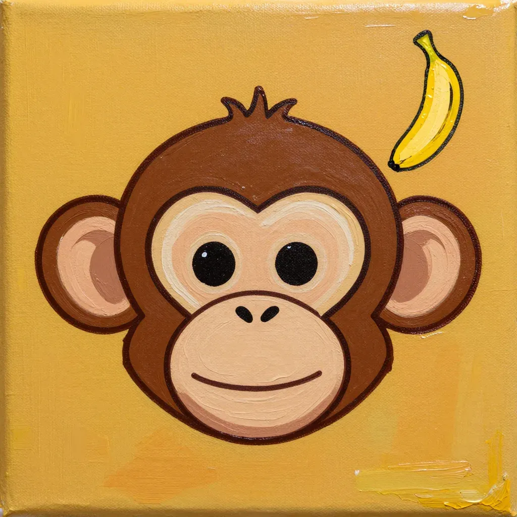A cheerful monkey with large expressive eyes and a smiling mouth, set against a vibrant yellow background. The soft, even lighting highlights the glossy texture of the paint, creating a bright and inviting composition.