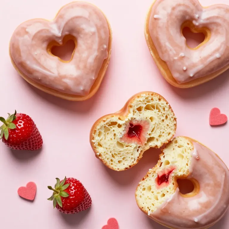 A heart-shaped donut with glossy white icing and vibrant red filling, cut in half to reveal its airy crumb and juicy interior. Soft, diffused lighting highlights the glossy texture of the icing and the vibrant red of the filling, creating a visually appealing composition against a soft pink background.