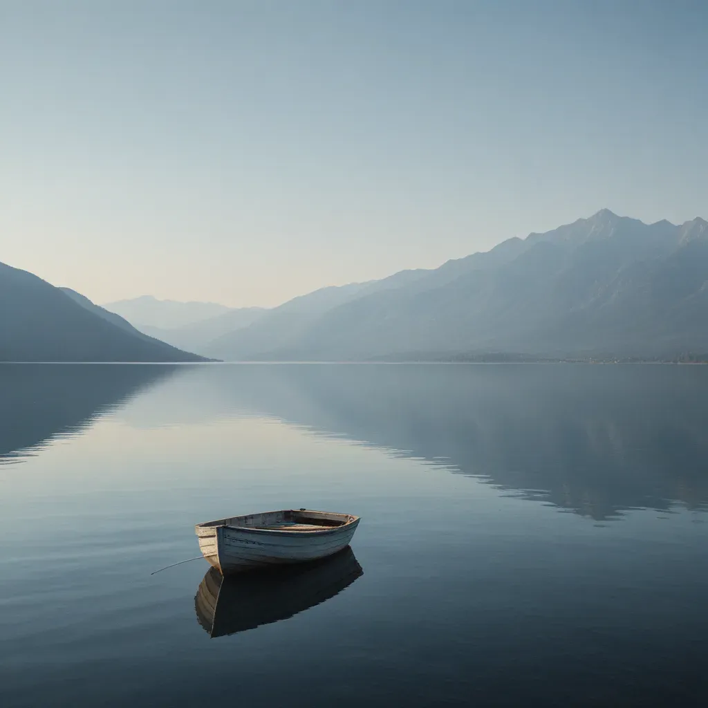 A small, weathered boat rests on a glossy lake, reflecting the soft, diffused light of a misty morning. The expansive background of misty mountains and distant landmass creates a tranquil, expansive setting.