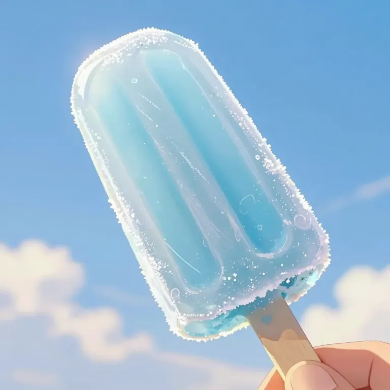A close-up of a translucent popsicle slice with a frosty exterior, set against a clear blue sky. The diffused sunlight highlights the frosty texture, creating a soft glow and emphasizing the creamy interior.