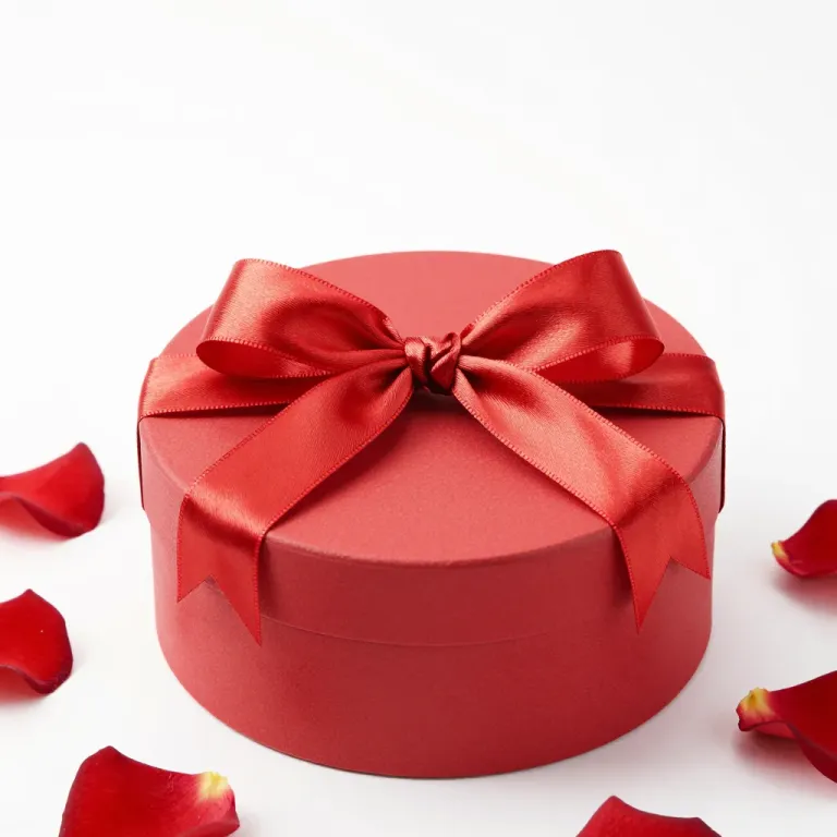 A glossy red heart-shaped gift box adorned with a silky red ribbon bow, softly lit from above, creating gentle shadows and highlights, with vibrant red rose petals adding depth and context against a clean white background.