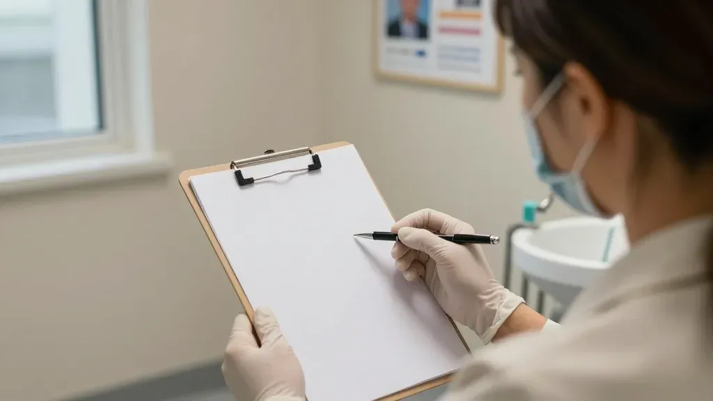 A healthcare professional, wearing a blue surgical mask and white gloves, meticulously reviews medical records on a clipboard in a clinical setting. The soft, diffused light from the window highlights the glossy clipboard and smooth gloves, creating a professional and focused atmosphere.