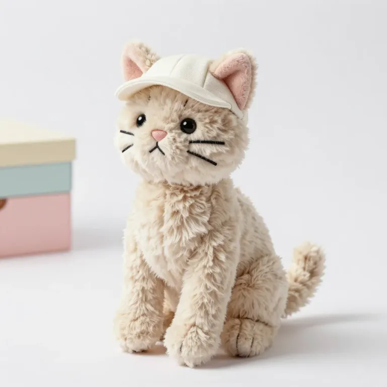 A soft, cream-colored plush cat wearing a light beige cap, softly lit to highlight its features and fur texture. The minimalist background with a hint of a pastel-colored box provides a clean and uncluttered setting, ideal for product photography and branding.