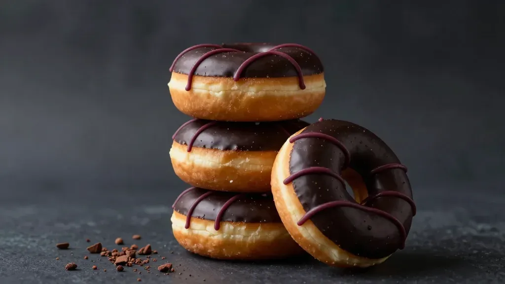A stack of glossy chocolate-glazed donuts with a slightly crispy texture, softly lit to highlight their glossy surface, set against a dark, slightly blurred background with scattered cocoa powder adding texture. The composition creates a sense of depth with a slight tilt of the donuts.