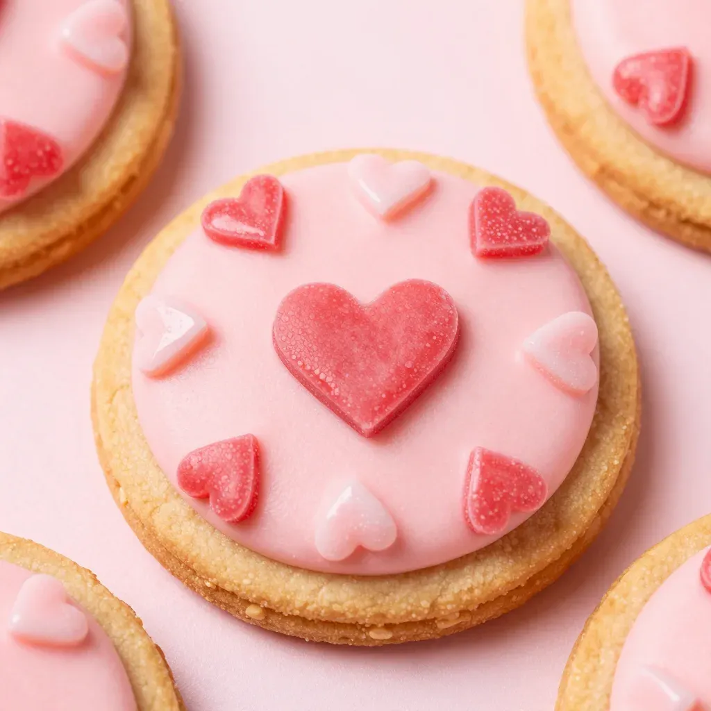 Close-up of a pink iced heart-shaped cookie adorned with glossy heart candies, illuminated by soft, diffused light that highlights the texture and vibrant colors, creating a clean and inviting backdrop with shallow depth of field.