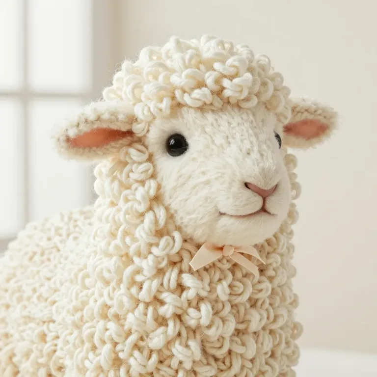 A close-up of a knitted lamb with curly wool and a gentle expression, softly lit to highlight the texture and casting gentle shadows. The neutral, blurred background keeps the focus on the lamb, providing ample copy space.