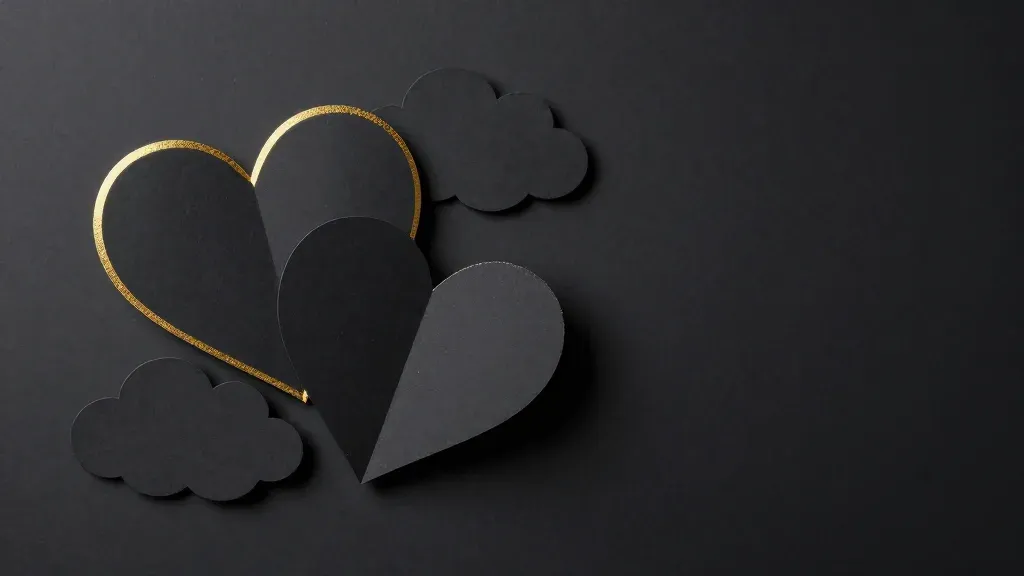 Rough paper clouds with glossy gold outlines softly lit from above, creating highlights and shadows, arranged in a centered, slightly asymmetrical composition against a dark, uniform black background.
