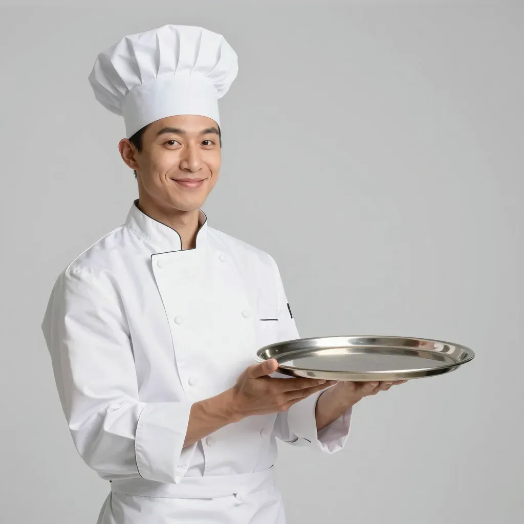 A chef in a crisp white uniform holds a polished silver platter, set against a neutral gray background. Soft, even lighting highlights the chef and platter, creating a professional and inviting atmosphere.