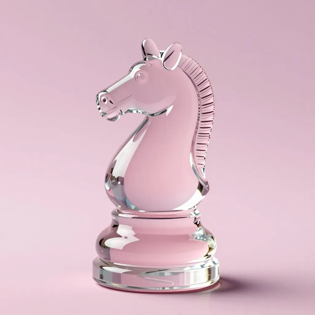 A polished pink crystal chess knight stands gracefully, its smooth, reflective surface catching the soft, diffused light from above. The minimalist background enhances the elegant simplicity of the piece, providing ample copy space for design integration.