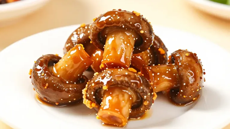 A cluster of tender shiitake mushrooms coated in a glossy, viscous amber sauce and sprinkled with golden sesame seeds. Soft front lighting creates subtle highlights on the sauce, while a shallow depth of field blurs the beige background, emphasizing the dish’s texture and arrangement.