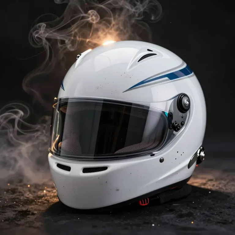 A white racing helmet with blue accents and a slightly fogged visor, set against a dark, smoky background, illuminated by soft, diffused light from above, emphasizing the helmet's glossy, smooth surface with small black specks.