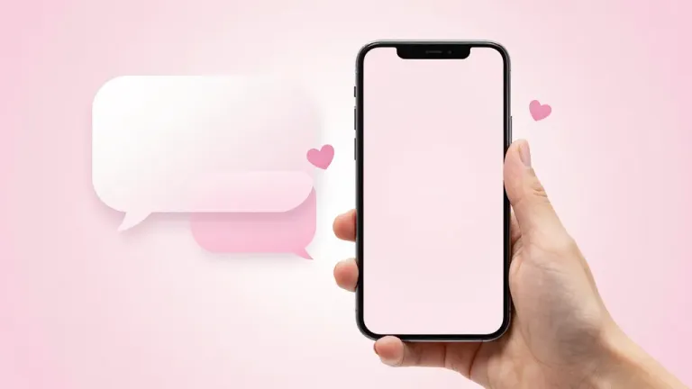 A hand gently holds a glossy smartphone with a white screen, set against a soft, pastel pink background. The composition highlights the smooth texture of the hand and the phone, with a speech bubble to the left and floating pink hearts, creating a clean and minimalistic aesthetic.