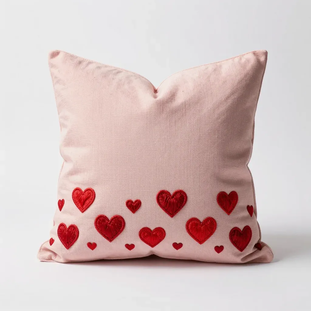 A soft, velvety pink throw pillow adorned with glossy red heart embroidery, set against a clean white background. The diffused lighting highlights the texture and vibrant colors, creating a warm and inviting aesthetic.