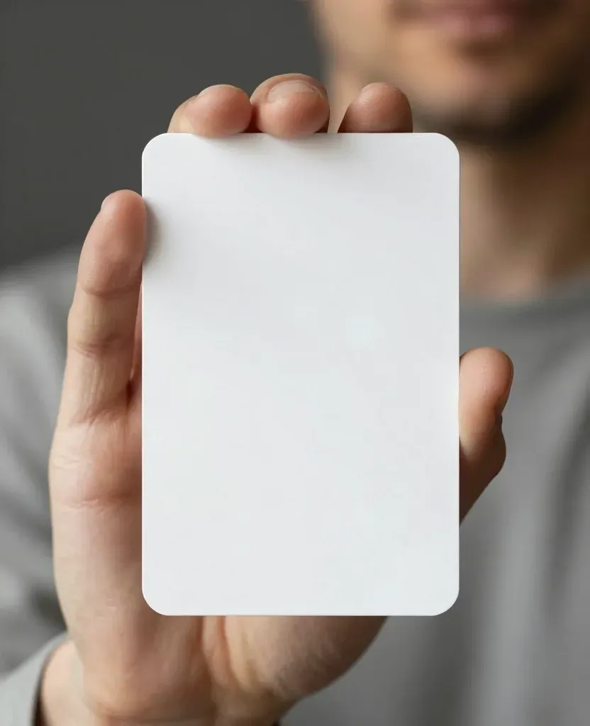 A hand delicately holds a smooth, slightly glossy white card against a soft, diffused light backdrop, creating gentle shadows and highlights. The close-up, shallow depth of field ensures the card and hand are sharply focused while the background remains blurred, providing clean copy space.