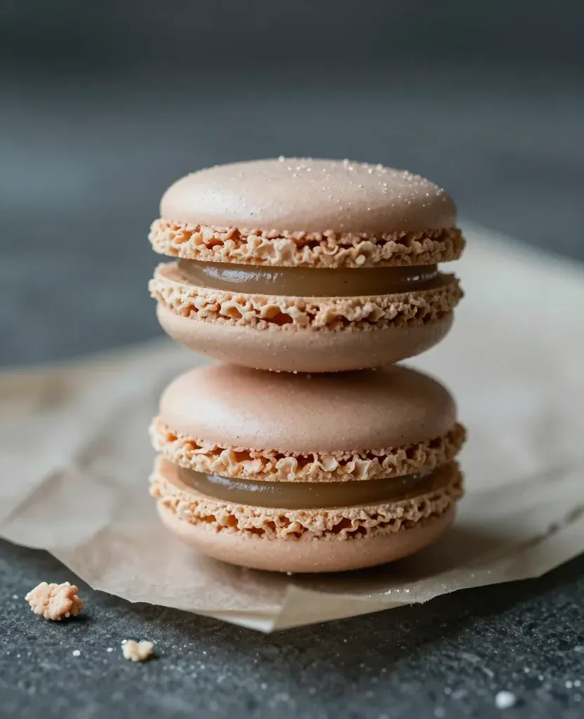A close-up of three pale pink macarons with glossy caramel filling, stacked neatly on white parchment paper, illuminated by soft, diffused light from above, creating subtle highlights and shadows. The blurred dark background and shallow depth of field emphasize the macarons, making them the focal point.