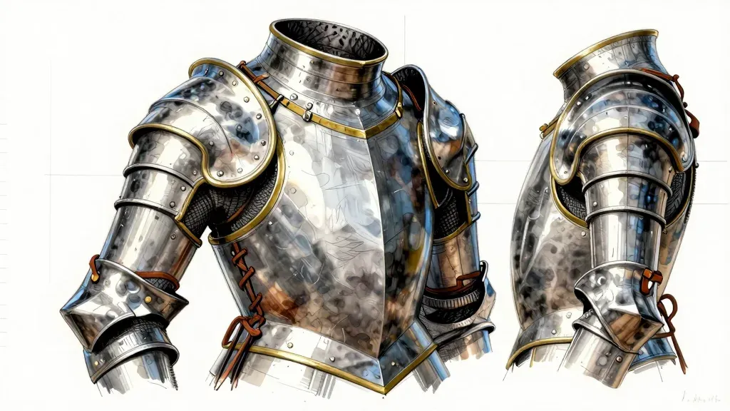 A detailed close-up of a cuirass armor, showcasing metallic plates with visible rivets and a glossy finish, illuminated by soft, diffused light that highlights the reflective surfaces and creates subtle shadows. The minimal white background ensures the focus remains on the intricate craftsmanship and textures of the armor.