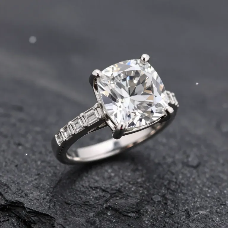 A close-up of a polished diamond engagement ring, its facets catching soft, diffused light, creating a warm, inviting glow. The shallow depth of field blurs the dark, textured background, emphasizing the ring's brilliance and elegance.